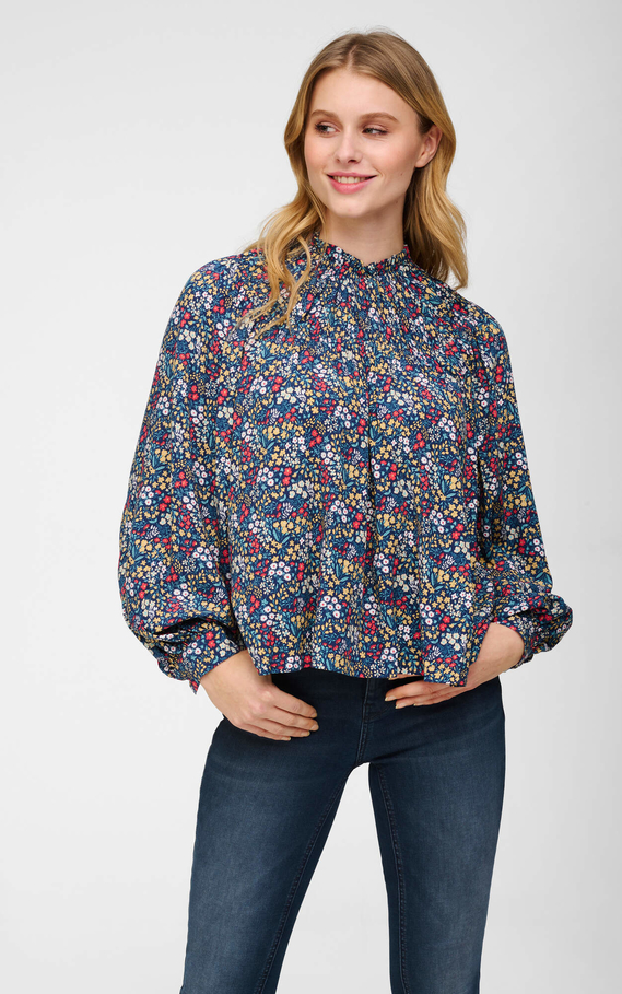 Damska damska bluzka o luźniejszym kroju, zaokrąglony dekolt, wycięcie z tyłu w kształcie łezki, zapinane na guzik, koronkowe wstawki na przodzie i rękawach, długie, luźne rękawy zakończone wąską gumką, wykonana z tkaniny bawełnianej