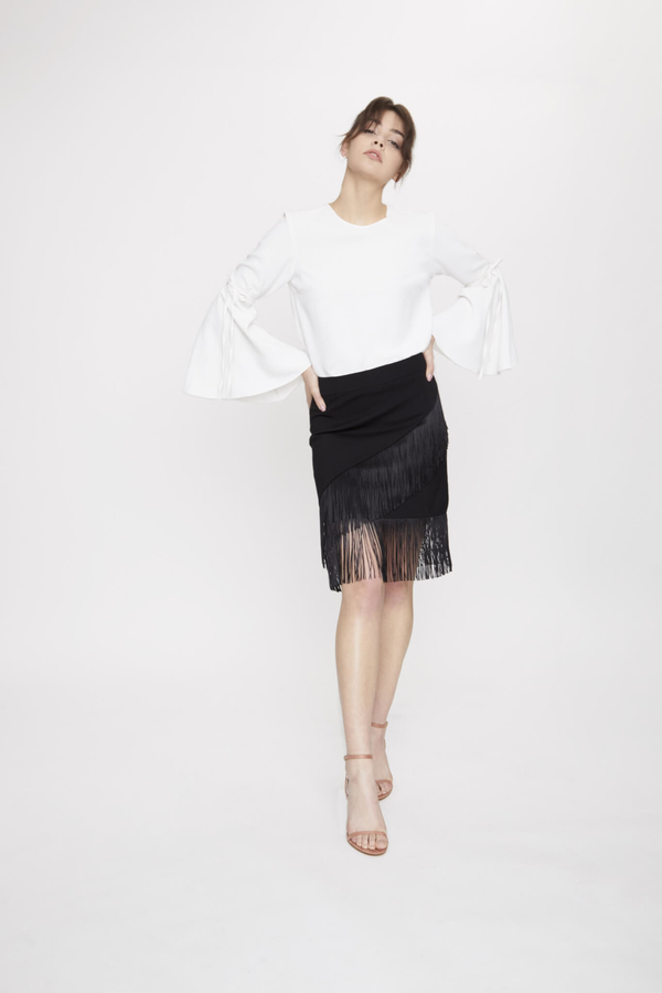 Co zdradza temperament kobiety? Jej ruchy. A ta spódnica je podkreśla. Z pozoru klasyczny krój i kolor kryje setki delikatnych, wiskozowych frędzli poruszających się w rytm każdego ruchu. Z przodu przecięcie pod skosem delikatnie wysmukla i maskuje wszelkie niedoskonałości. Sprężysta dzianina dopasowuje się do kształtu sylwetki. Zapinana na kryty suwak z tyłu, wykończona paskiem i delikatną podszewką, dzięki czemu idealnie przylega do ciała. SPÓDNICA ZAPROJEKTOWANA I USZYTA W POLSCE
